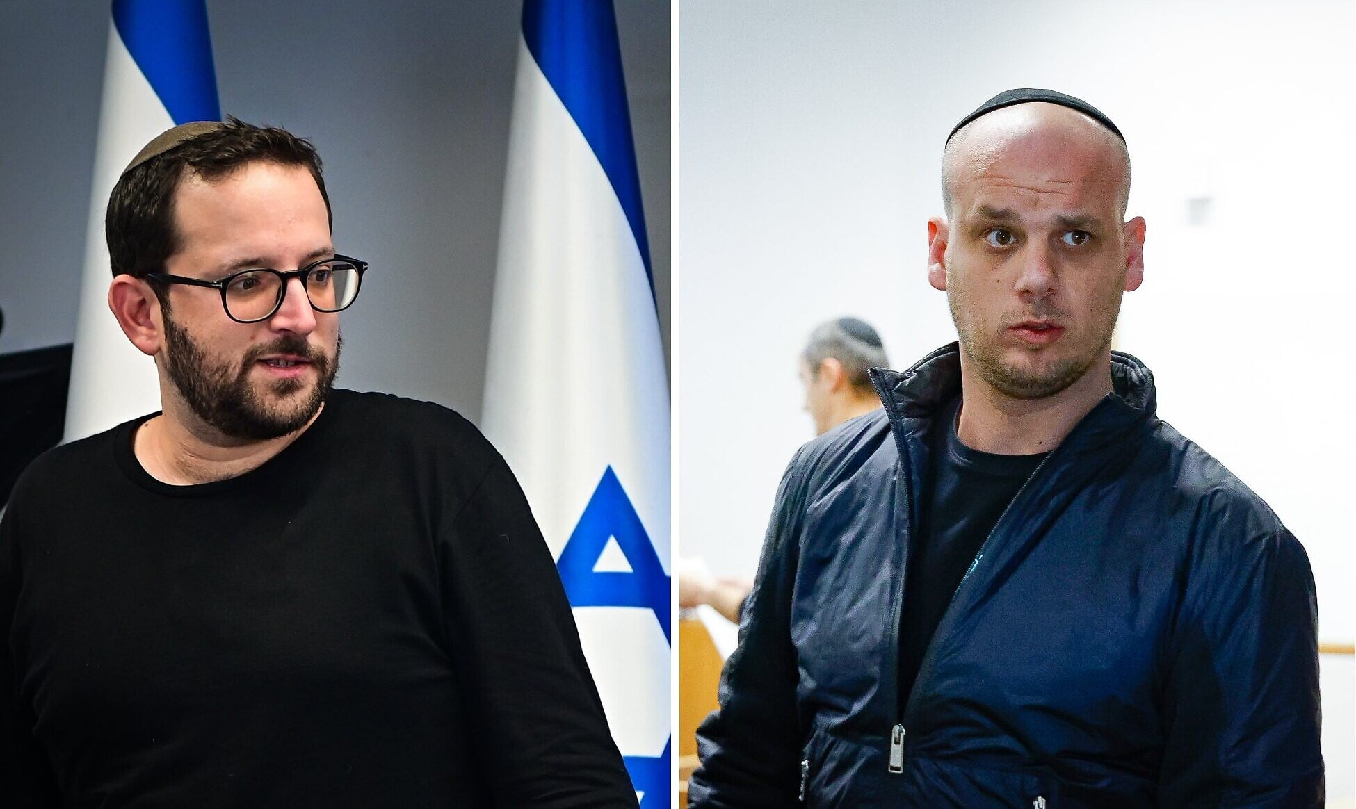 (L) Jonatan Urich, adviser to Benjamin Netanyahu, in Tel Aviv on October 3, 2022 (Avshalom Sassoni/ Flash90/ File) and (R) Eli Feldstein arrive for a court hearing at the Tel Aviv District Court on March 11, 2025. (Yehoshua Yosef/ Flash90)