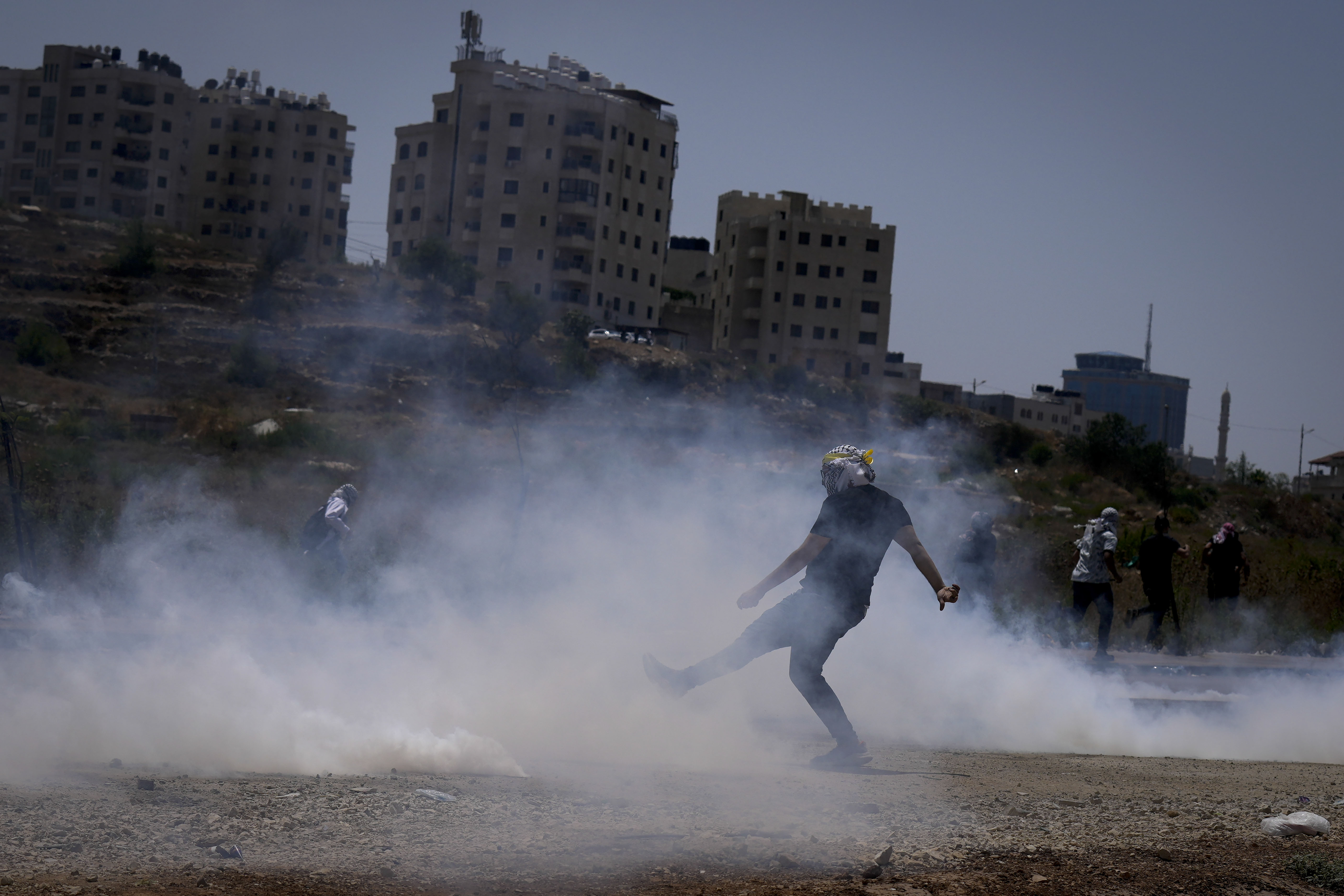 Palestinian protesters run away from tear gas during clashes with Israeli forces following a demonstration against Israel’s airstrikes on Gaza Strip, near the West Bank Jewish settlement of Beit El, Aug 6, 2022. (PHOTO / AP)