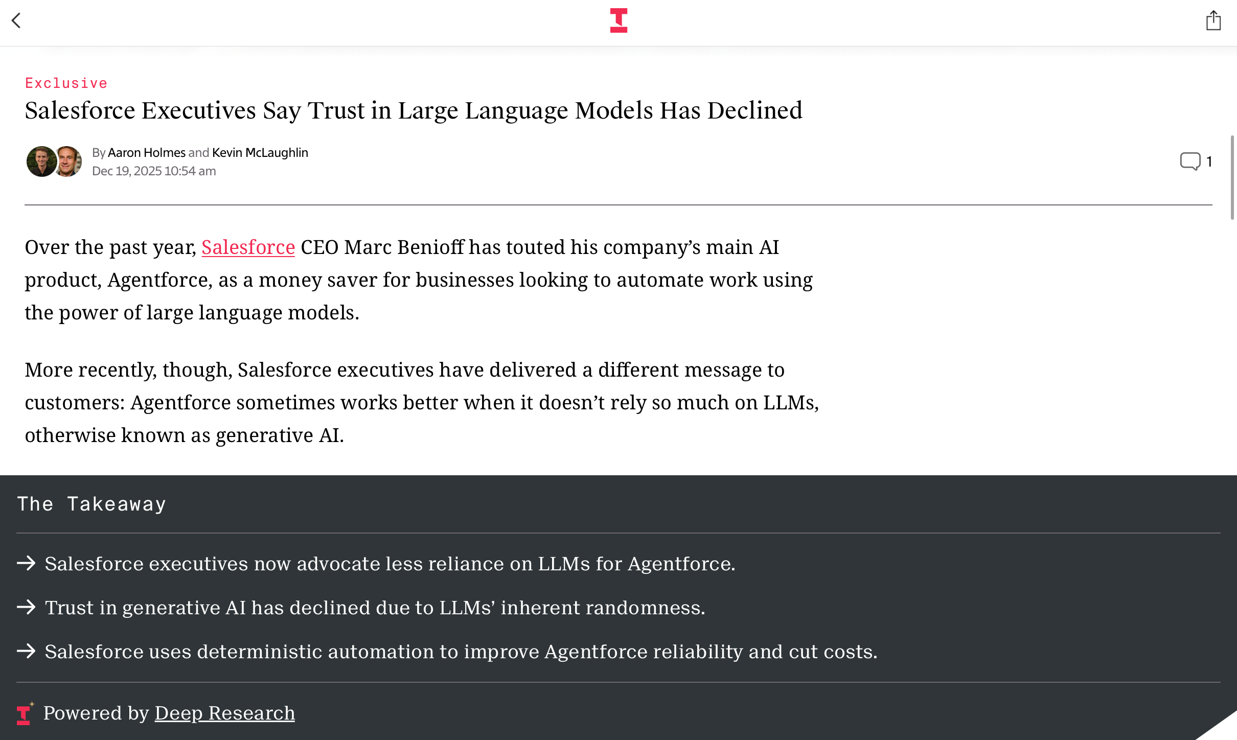 Meanwhile, in an echo of The Klarna Effect, Salesforce is backing down on its own enthusiasm for LLMs, warning that they aren’t trustworthy. The Information quotes an exec there as saying that trust in generative AI (you know, the kind that you need all those data centers for) has declined over the last year: