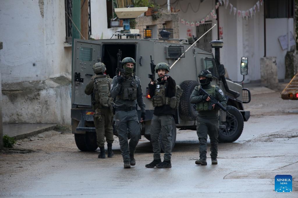 Members of Israeli forces stand guard as an Israeli bulldozer demolishes a house in the town of Bizzariya, northwest of Nablus in the West Bank, on Dec. 24, 2025. (Photo by Nidal Eshtayeh/Xinhua)