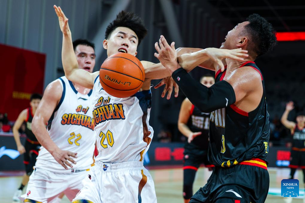 Zhang Gaoming (L) of Sichuan Blue Whales defends He Xining of Shenzhen Leopards during the 6th round match at the 2025-2026 season of the Chinese Basketball Association (CBA) league in Shenzhen, south China’s Guangdong Province on Dec. 24, 2025. (Photo by Peng Zhigang/Xinhua)