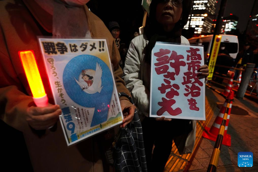 People holding signs attend a rally in front of the Japanese Prime Minister’s Office in Tokyo, Japan, Dec. 23, 2025. Japanese citizens held a rally on Tuesday evening in front of the Prime Minister’s Office in Tokyo, demanding that Prime Minister Sanae Takaichi retract her erroneous remarks on Taiwan and criticizing comments by a senior government official advocating nuclear armament. (Xinhua/Jia Haocheng)