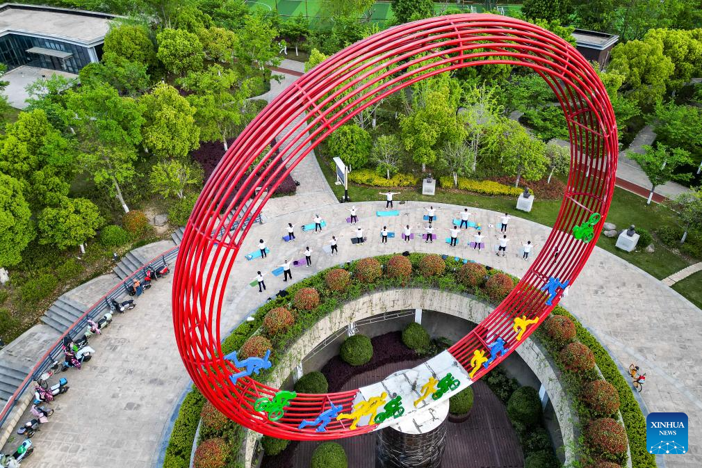 A drone photo taken on April 14, 2025 shows people exercising at Waizhuang park in Huzhou City, east China’s Zhejiang Province.