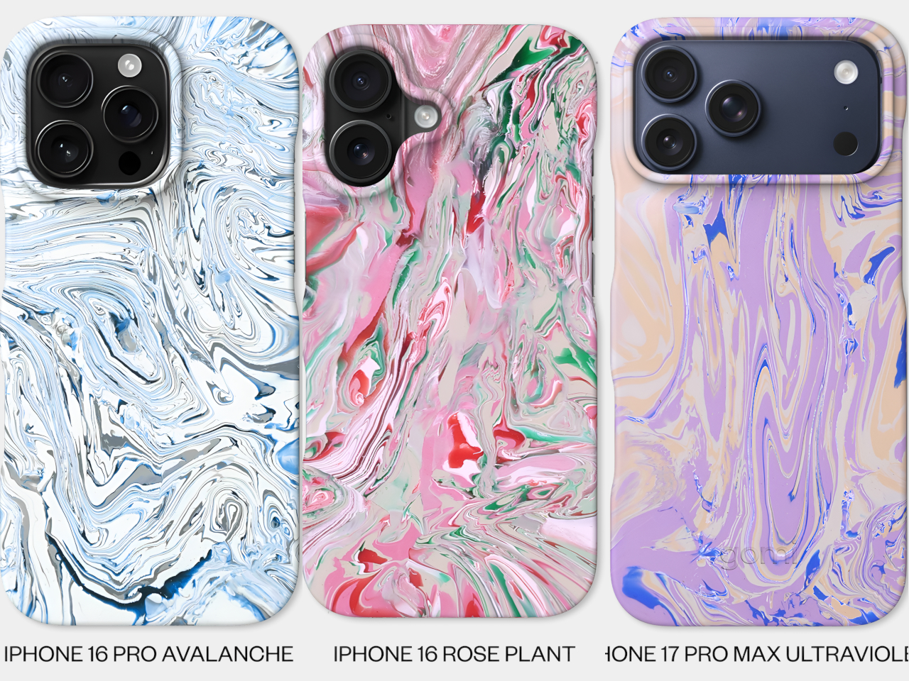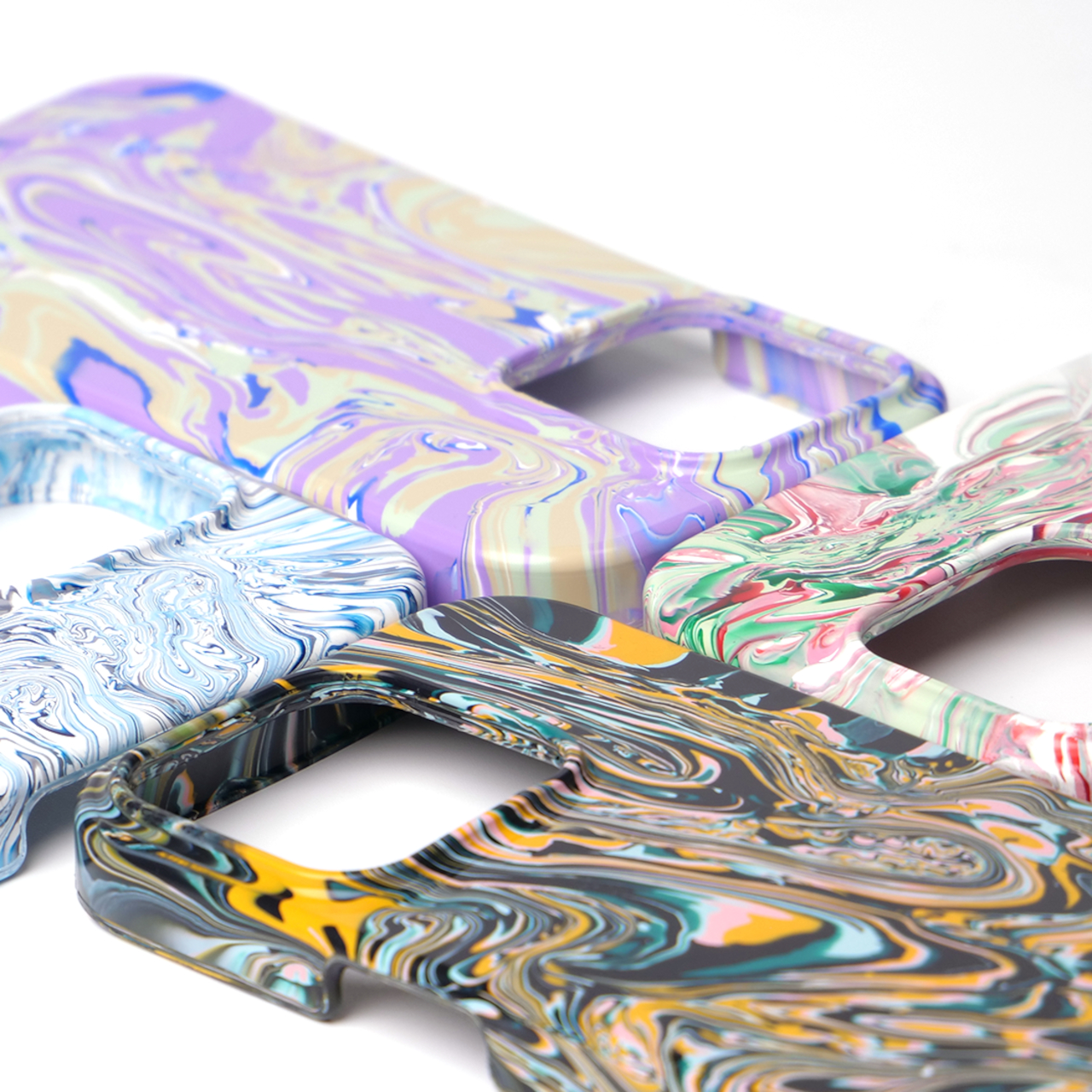 Each case is pressed from mixed plastic, creating a marbled pattern that cannot be repeated. No two cases are the same, which makes the randomness part of the appeal rather than a defect. Colourways like Panther or pastel mixes become loose guidelines rather than exact prints, and the result is a one-of-one object that looks like a tiny slab of recycled terrazzo wrapped around your phone, and no one else has the exact pattern.