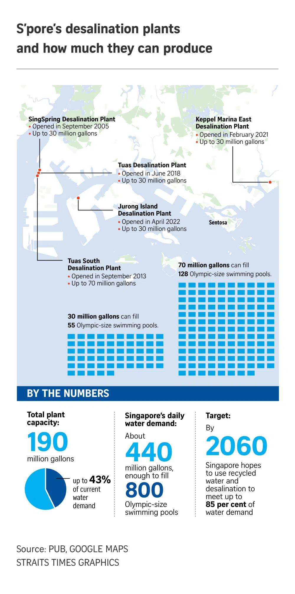 Currently, Singapore’s daily water demand is about 440 million gallons, which is sufficient to fill 800 Olympic-sized swimming pools.