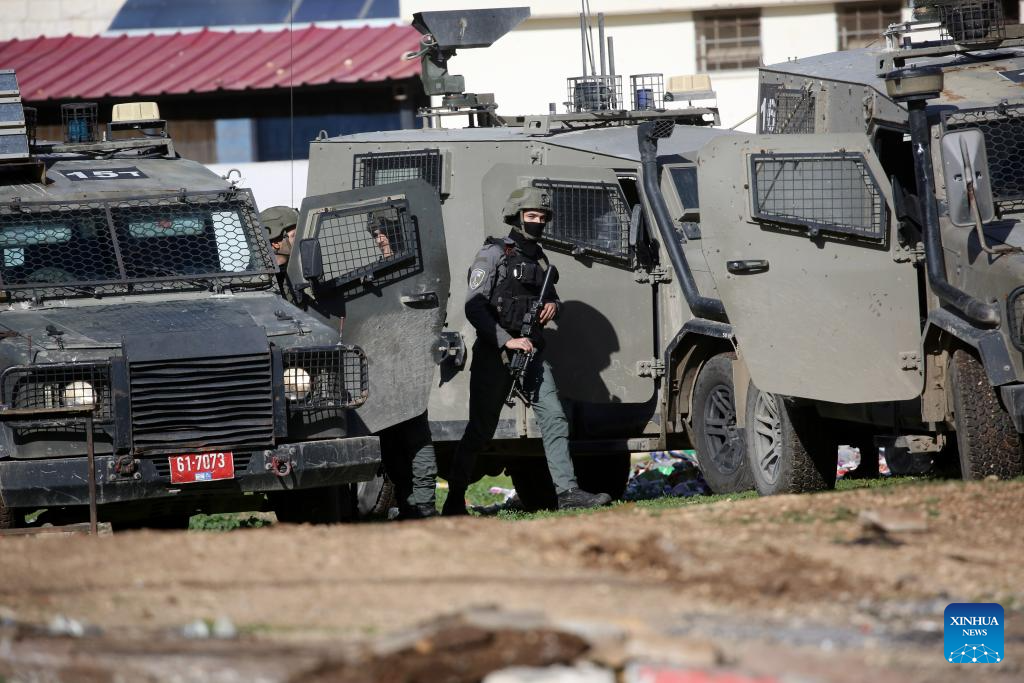 Israeli military vehicles and soldiers are pictured during a military operation in the town of Qabatiya, south of Jenin in the West Bank on Dec. 27, 2025.In the northern West Bank, Israeli troops maintained a tight siege on the town of Qabatiya for a second day. Qabatiya’s Mayor Ahmed Zakarneh said Israeli forces have closed entrances, imposed a curfew, damaged infrastructure and raided homes. (Photo by Nidal Eshtayeh/Xinhua)