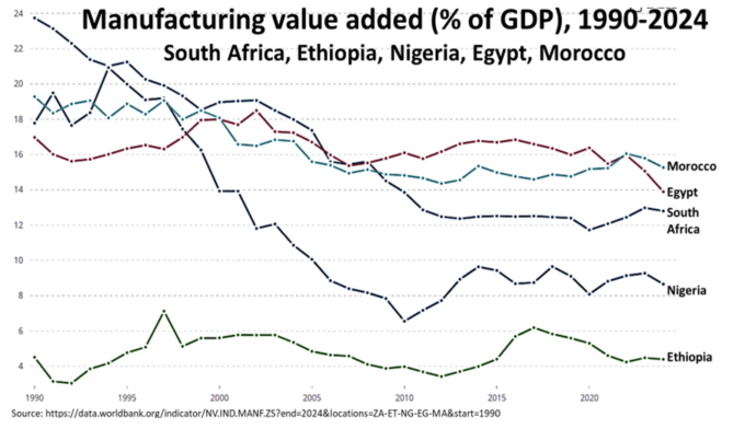 Formidable Chinese product competition means the African economies mentioned by Prashad as the continent’s lead industrial production sites, plus the largest in population (Nigeria), have not improved their manufacturing/GDP ratios since that 2015 FOCAC industrialization hype. Most such ratios, like South Africa’s, had already collapsed in the first round of 1990s-era trade liberalization.