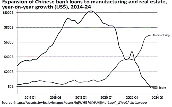 One reason for the overproduction of those goods, is the Chinese state’s ambition and ability to redirect credit flows (often at below-market rates), as can be seen in the year-on-year growth in Beijing’s (centrally-directed) lending to its own firms. This is a revealing case in which public policy amplifies capitalism’s underlying contradictions (the classic ‘pro-cyclical’ bias of neoliberalism). So after the early-2019 year-on-year increases in lending to China’s bubbly real estate sector hit $1 trillion, at the peak of the economy’s chaotic property speculation, then, contributing to the bubble’s burst, loans fell rapidly in 2021, down to no year-on-year growth by early 2024.