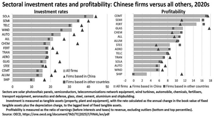 However, whether this investment can be justified by sustained profitability remains to be seen, for as the OECD shows, China’s rates are generally lower overall than in other countries, and especially in several (mainly old-economy) sectors including semiconductors, fertilizers, chemicals, aluminium, steel, and aeronautics and defense.