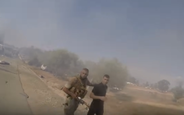 Suhayb Razem held by a Hamas terrorist at the Nova festival site, October 7, 2023. (Screenshot: YouTube, 27a clause of copyright law)