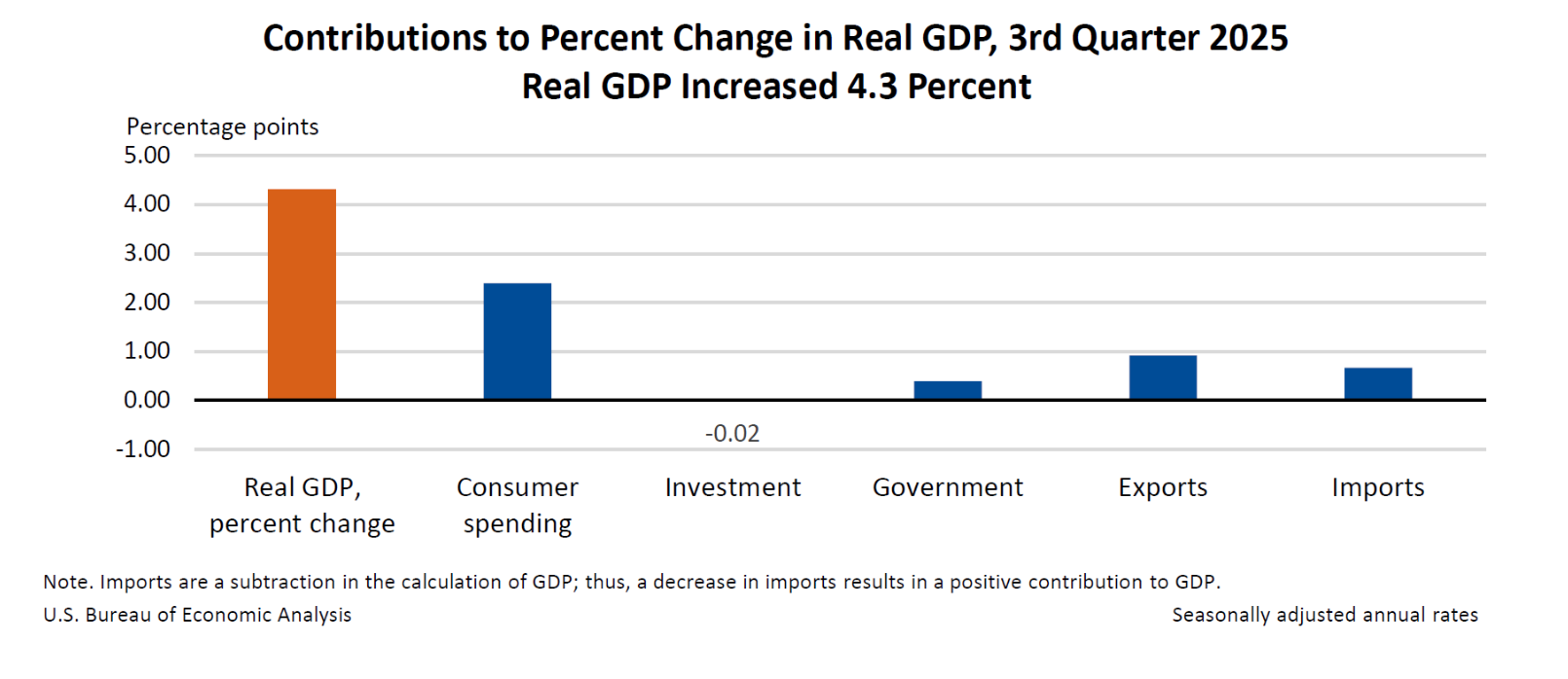 The U.S. economy posted robust growth in the third quarter of 2025, expanding at an annual rate of 4.3% according to the initial estimate released by the Bureau of Economic Analysis. The acceleration from the second quarter’s 3.8% growth rate tells only part of the story, however. A closer examination of the underlying components reveals that the third quarter’s expansion was not only faster but built on a far healthier, more broad-based foundation than the growth recorded earlier in the year.