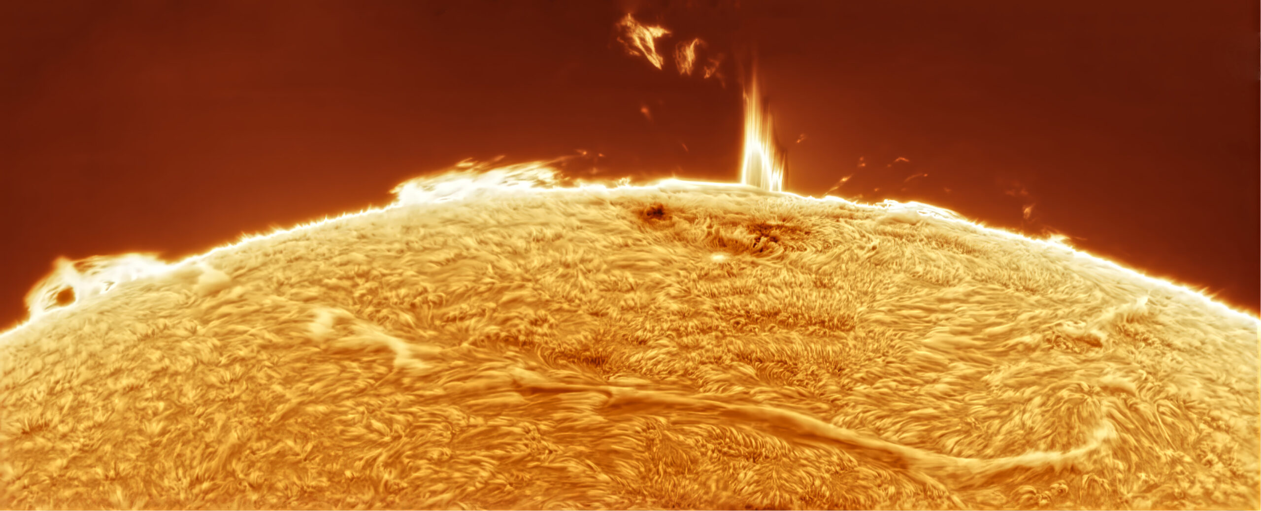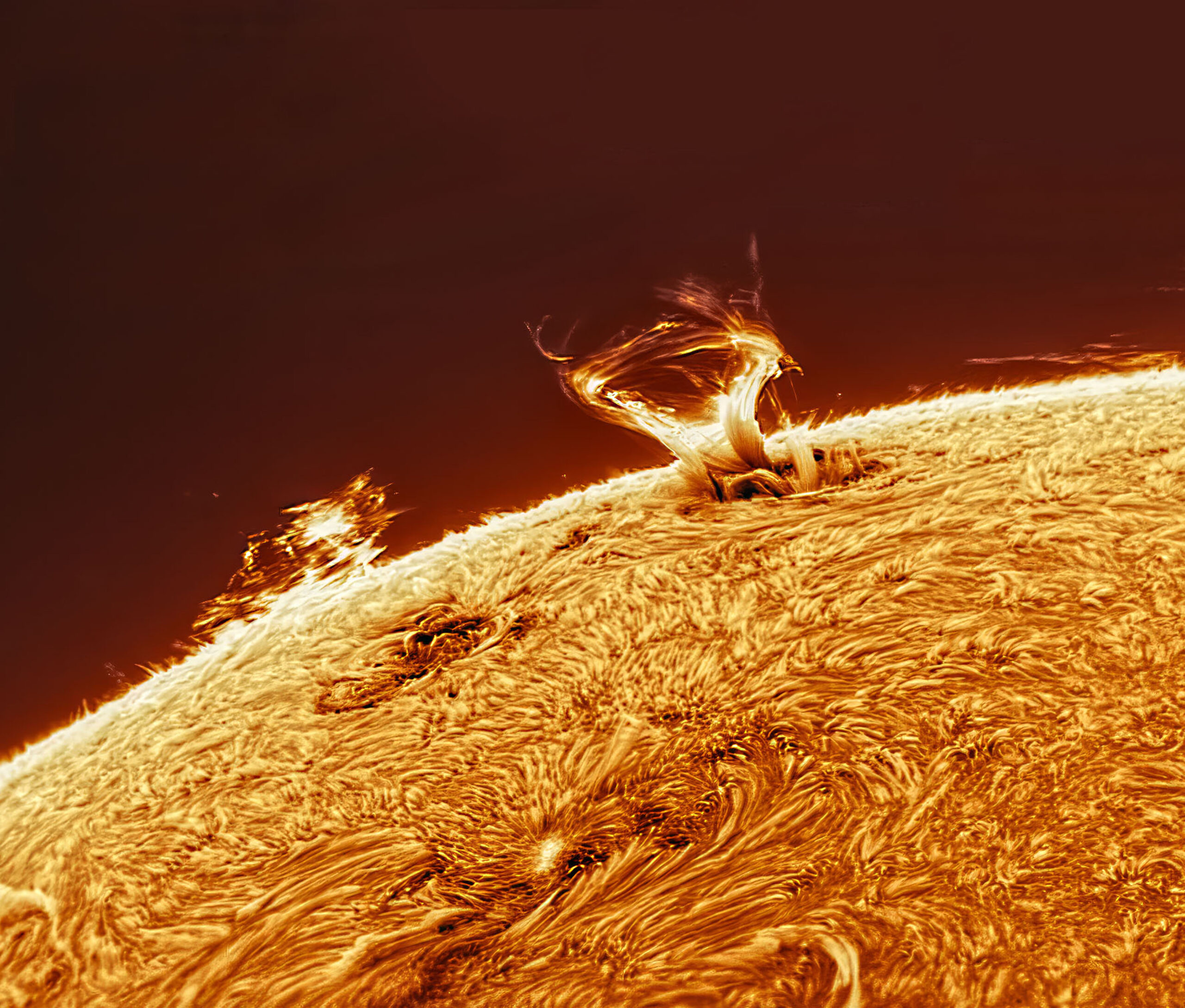 The Sun’s dynamic magnetic field causes ionized hydrogen to leap off the star’s edge, or limb, forming dramatic arcs visible at Hα wavelengths. Credit: Mark Johnston
