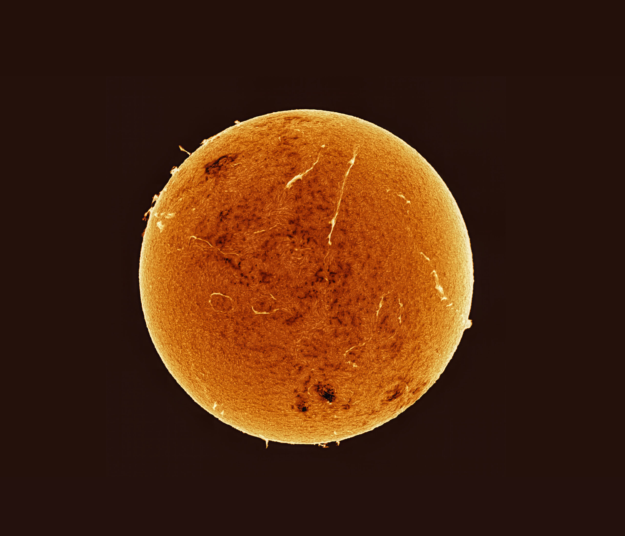 Solar imaging has also benefited from an array of recent software. A typical imaging workflow might start with a program like SharpCap Pro or Firecapture, which are optimized to capture high-speed video of the Sun, with each frame fast enough to “freeze” turbulence in the atmosphere. The image-stacking program Autostakkert!4 can extract only the most in-focus frames. The resulting TIFF file can then be sent to the processing program ImPPG, which can stretch and tease out faint prominences while sharpening the surface. This image in turn can then be opened in Affinity Photo, Photoshop, or PixInsight, which will convert mono to color and further sharpen and improve surface contrast.