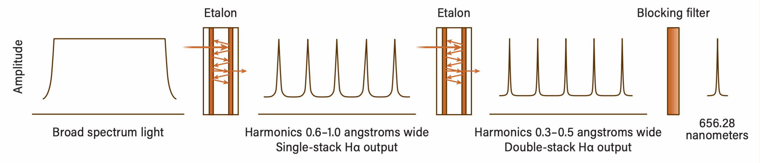 The result is a series of narrow transmission peaks — the desired wavelength (such as the Hα line) plus other wavelengths that are harmonics of that wavelength. Stacking two etalons narrows these peaks further. Finally, a blocking filter selects just one of these harmonics while blocking others.