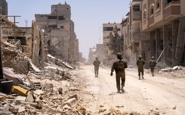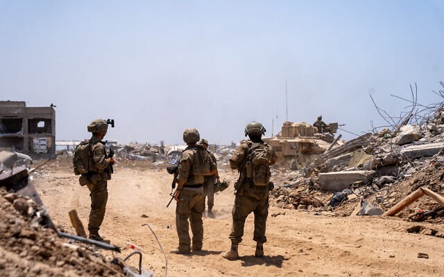 IDF troops of the Givati Brigade are seen in northern Gaza’s Beit Hanoun, July 30, 2025. (Emanuel Fabian/Times of Israel)