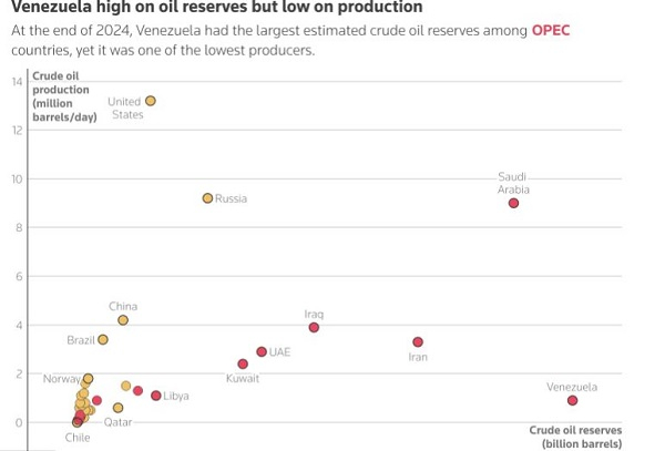 A scatter plot showing crude oil reserves on the horizontal axis and crude oil production on the vertical axis for OPEC and non-OPEC countries at the end of 2024.