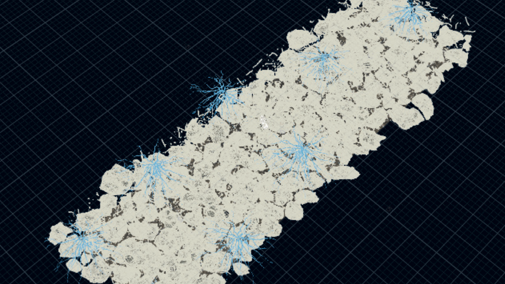 Forensic Architecture and David Wengrow, “The Nebelivka Hypothesis,” 2023. Soil structure. Wireframe view of the structure of the soil composed of worms’ channels, debris, minerals, and plant roots. Sunflower roots are highlighted in blue. © Forensic Architecture.