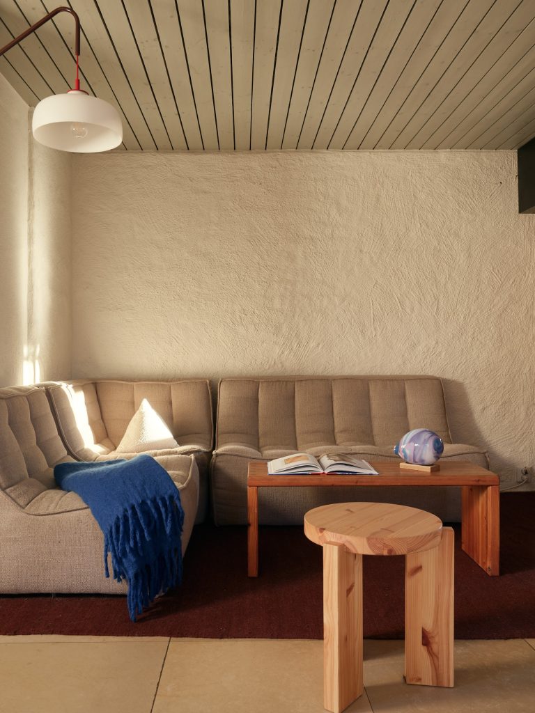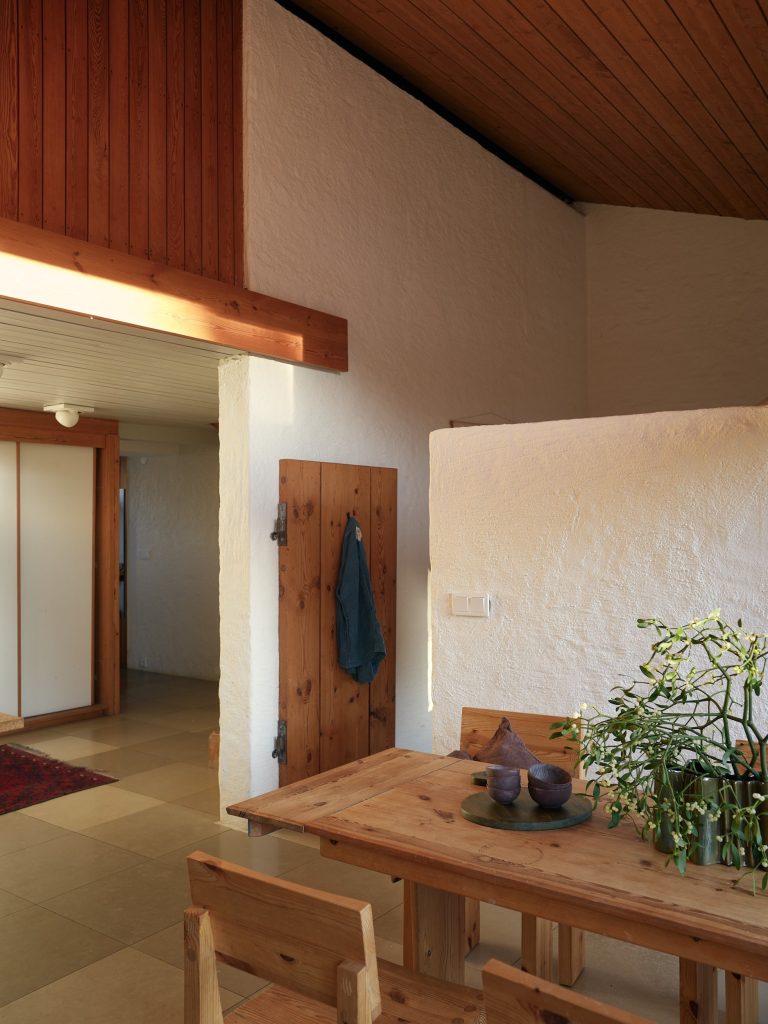 Now arranged as a two-level apartment in Mälarhöjden, southwest Stockholm, the 141sqm home forms the largest of three residences created from the original studio. The material palette is deliberately pared back: exposed timber joinery, simply fixed wood ceilings, white rendered walls, limestone floors and brickwork define the spaces throughout. Two fireplaces anchor the plan, while generous social spaces unfold naturally from the original atelier volume. A spa area and carefully integrated storage sit alongside the primary rooms, reinforcing the sense of a working building adapted thoughtfully for everyday life.