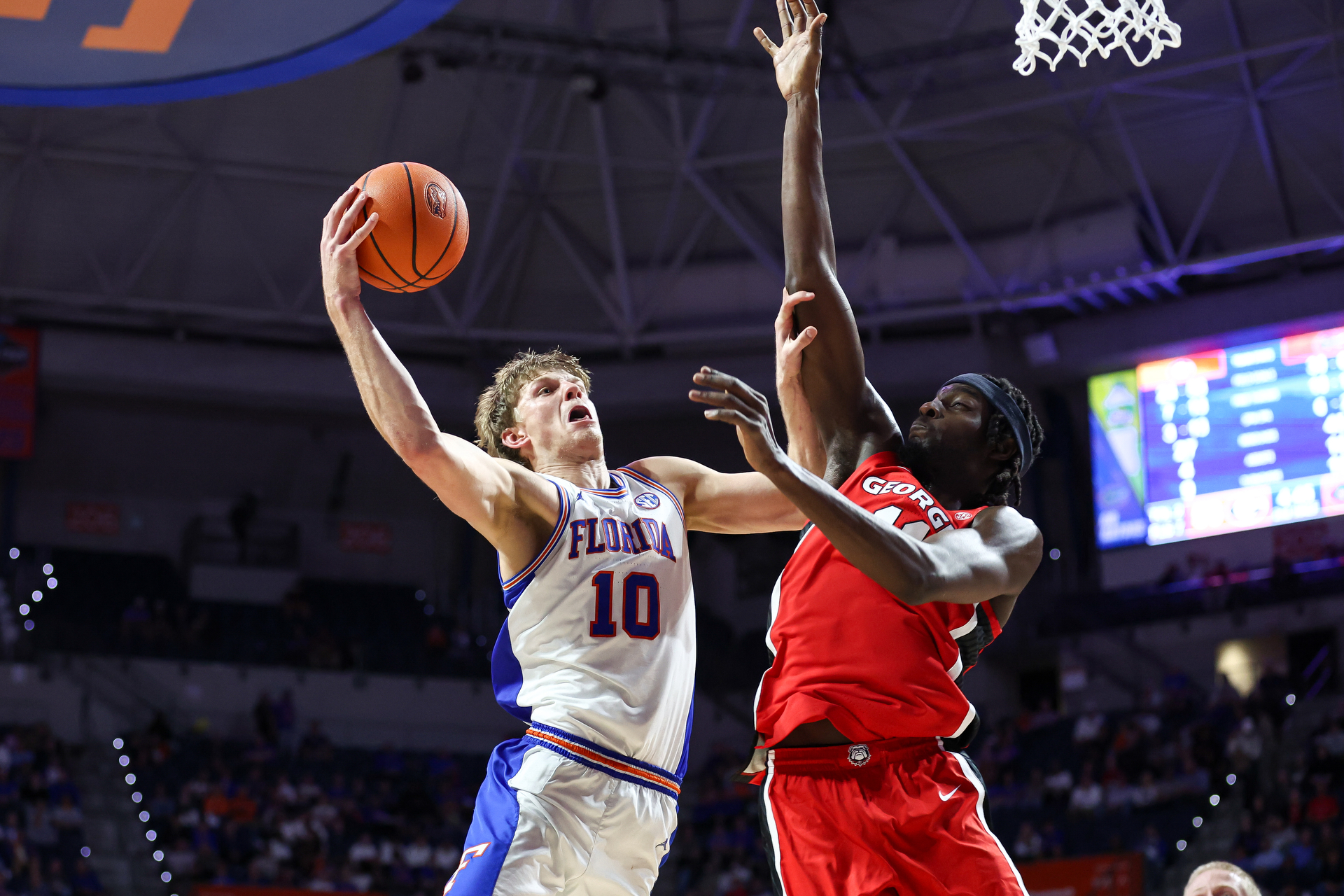 Georgia’s 6-foot-11, 260-pound sophomore center Somto Cyril, who came in averaging 10 points on 81% shooting, 6.4 rebounds and league-leading 2.8 blocks a game, was ejected with 10:14 to go in the first half for throwing a punch at Chinyelu and the Gators leading just 22-21. UF, though, could not immediately take advantage of his absence, as the two teams played even to halftime, with the Gators leading just 41-40 at the break, and the Bulldogs scoring a dozen points off seven Florida turnovers.