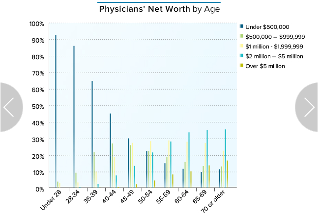This little demonstration pretty much stacks up with what we see when we look at net worth surveys of doctors in their 60s. I have no idea of the net worths of my various partners, but we can look at the Medscape surveys from back when they used to report this information for thousands of doctors.