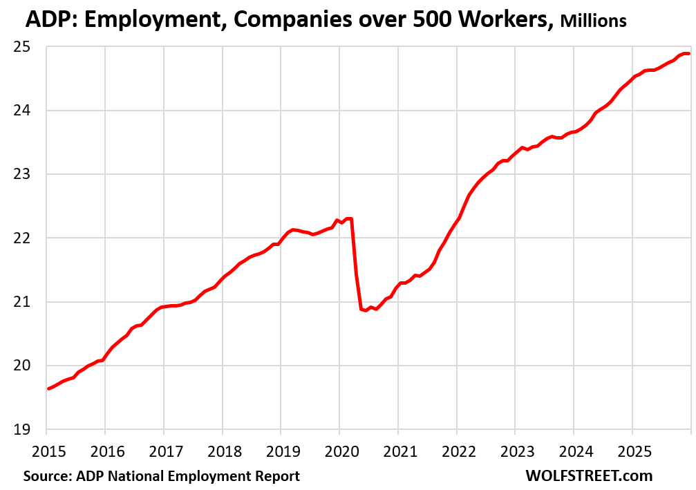 Larger companies with 500 and more employees added only 2,000 jobs in December, after the job gains in the prior six months (+264,000). Their payrolls rose to a record 24.89 million.