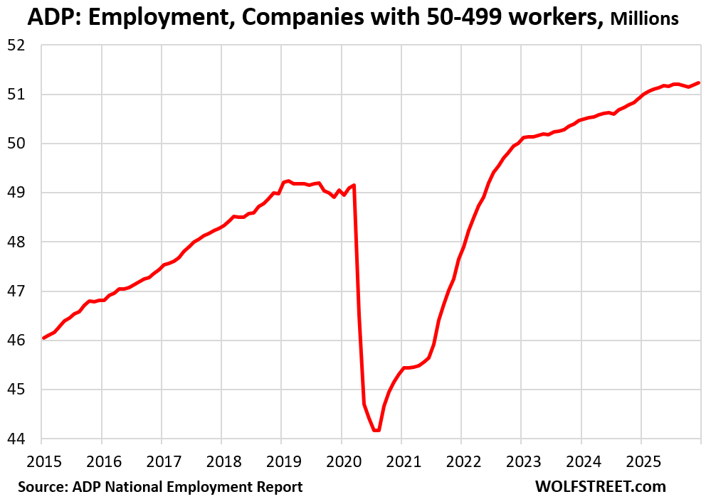 Medium-size companies with 50-499 workers added 34,000 jobs to their payrolls in December, the second increase in a row (November +45,000), after three months of declines, bringing the total to a record 51.23 million employees.