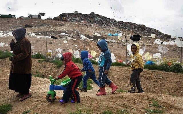 File: This file photo taken on February 7, 2016 shows Israeli Arab Bedouin children of the Tarabin tribe playing in their unrecognized Bedouin village next to the Dudaim dump site (background), the biggest landfill in Israel near the city of Rahat in southern Israel. (Menahem Kahana/AFP)