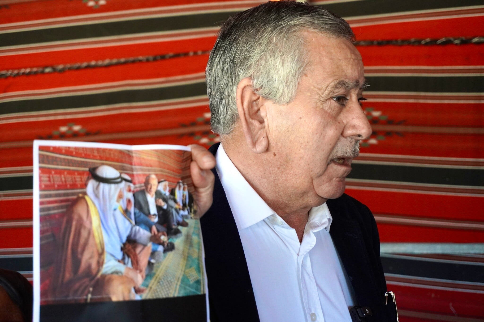 Speaking in a tent used for official business in Tarabin al-Sana, Rahat Mayor Talal Alkernawi  — who heads Israel’s largest Bedouin city — held up a picture of Netanyahu being hosted in the village nearly five years ago and demanded the premier intervene in the operation.