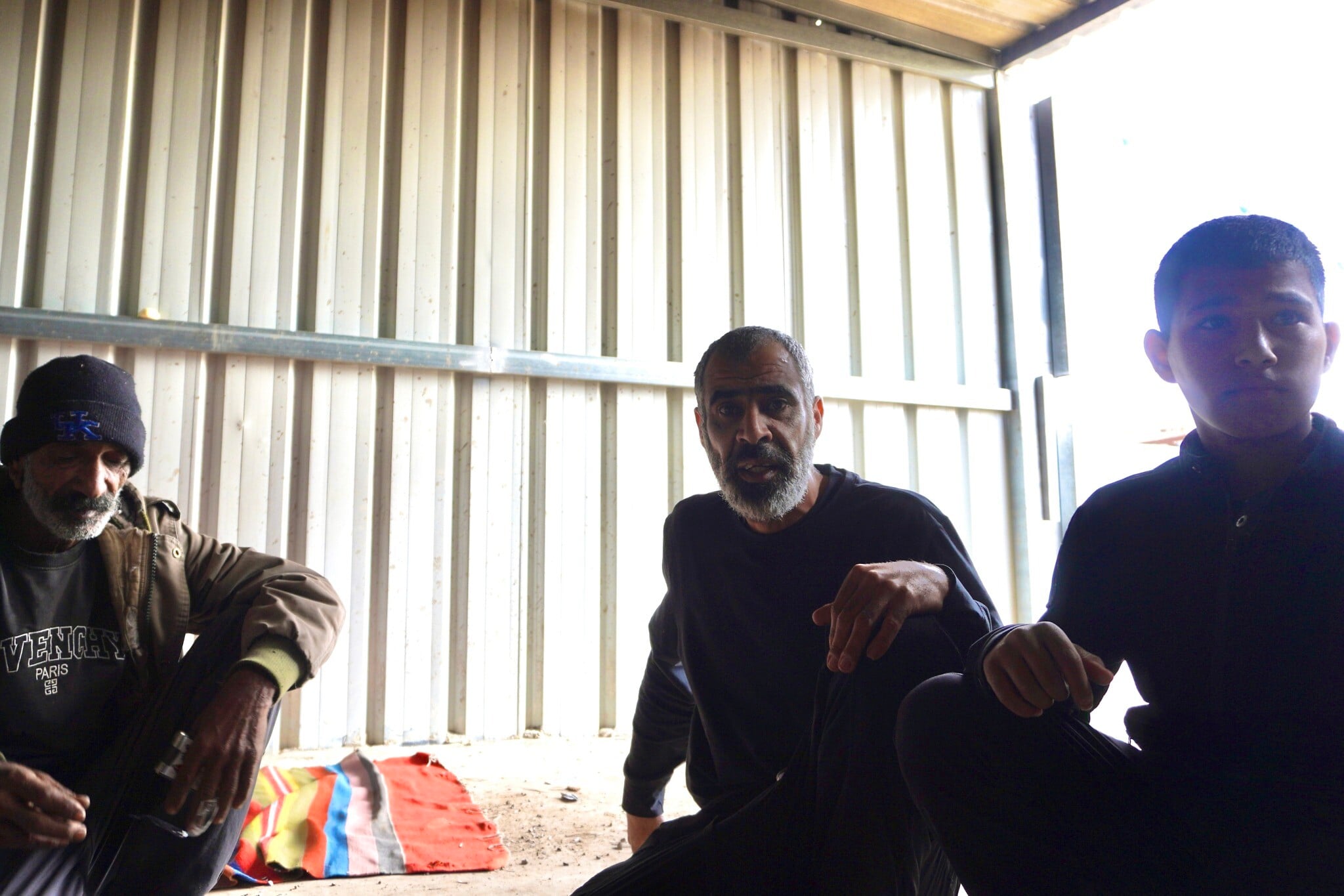 Nasser (left) and Ahmad (center) Tarabin, along with Ahmad’s son, Adam, sit and drink tea in the southern village of Tarabin al-Sana on December 31, 2025. (Charlie Summers/Times of Israel)