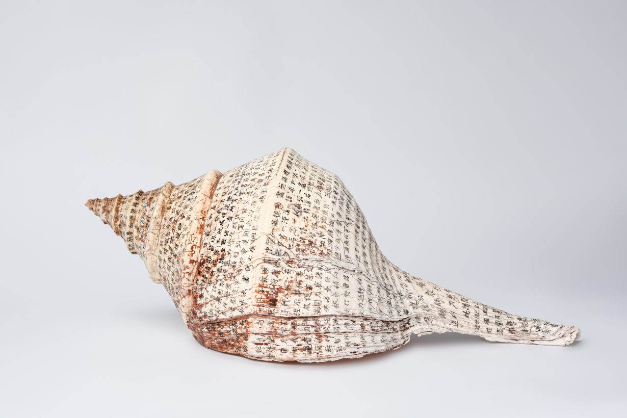 An Ocean of Prayers. 2025. 19.5 x 52 x 25 cm. Ink on natural shell. Courtesy the artist