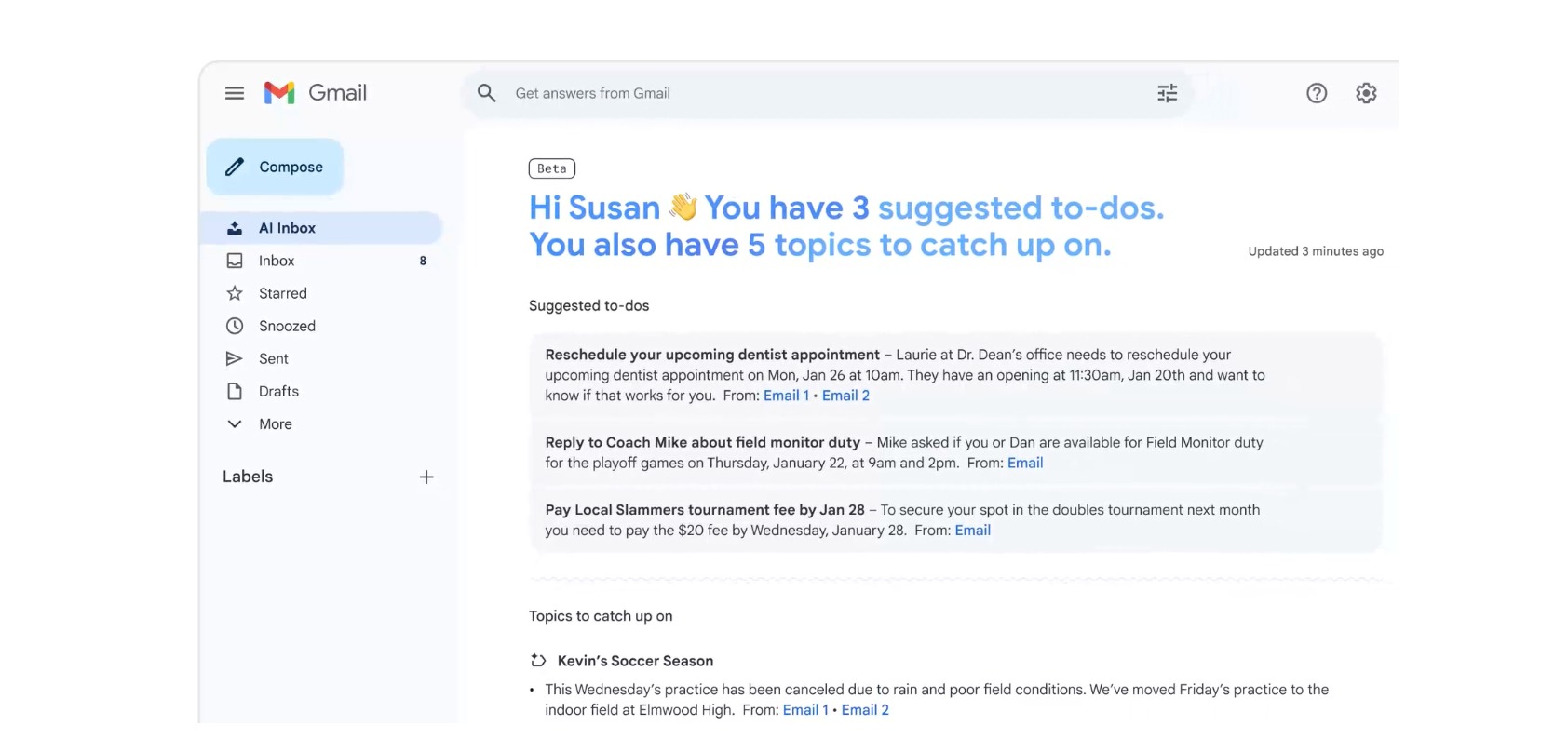 The sample in the announcement greets the user “Susan” by suggesting three action items and five topics to catch up on, all based on emails in Susan’s inbox. The suggestions include rescheduling a dentist appointment, replying to a kid’s coach, and paying a bill.