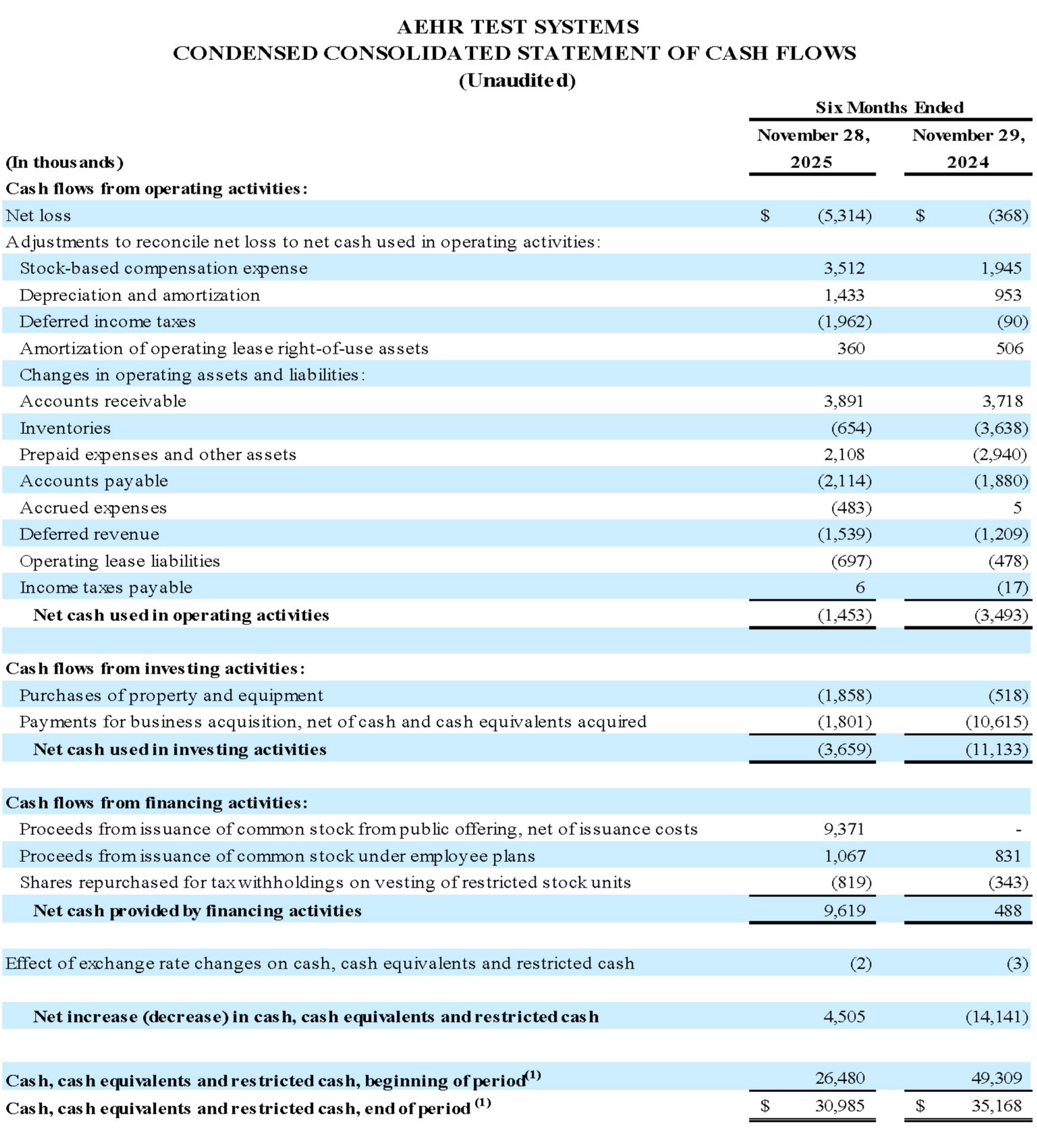 For the second half of fiscal year 2026 that began November 29, 2025 and ends May 29, 2026, Aehr expects revenue between $25 million and $30 million and non-GAAP net loss per diluted share between $(0.09) and $(0.05).
