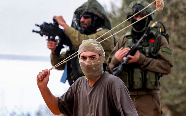IDF soldiers stand behind a masked settler swinging a slingshot while hurling stones at Palestinians who had gathered for the annual olive harvest season, during an attack by Israeli settlers on the West Bank village of Beita, south of Nablus, on October 10, 2025. (Jaafar Ashtiyeh/AFP)