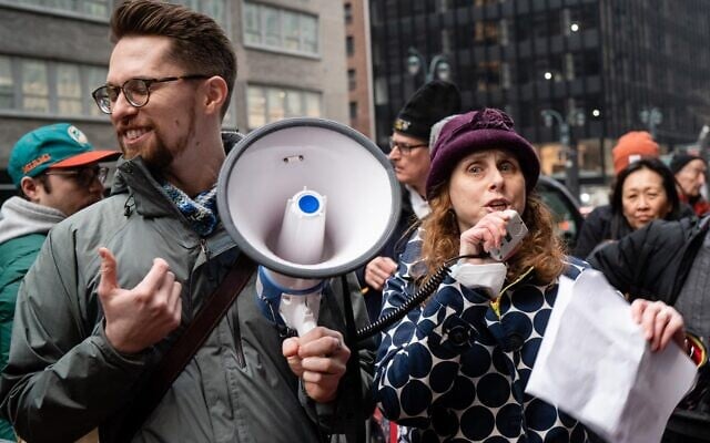 Illustrative: Rabbi Jill Jacobs at a protest against the Israeli government’s proposed judicial reforms in New York City, February 21, 2023. (Luke Tress/Times of Israel)