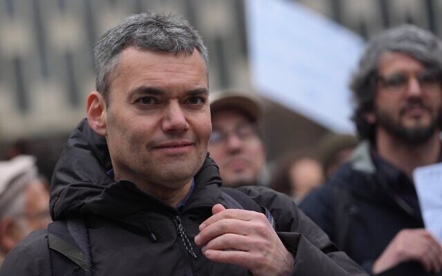 Peter Beinart speaks at a rally to release Columbia University graduate Mahmoud Khalil, who’d been detained by ICE after his involvement in pro-Palestinian, anti-Israel activism, on March 20, 2025, at Foley Square in New York City. (Selcuk Acar/Anadolu via Getty Images via JTA)