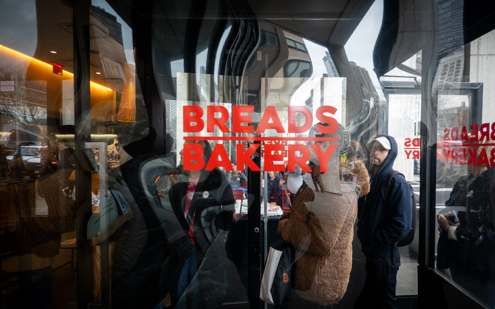 Customers line up at Breads Bakery on the Upper West Side of Manhattan, January 9, 2026. (Luke Tress/Times of Israel)