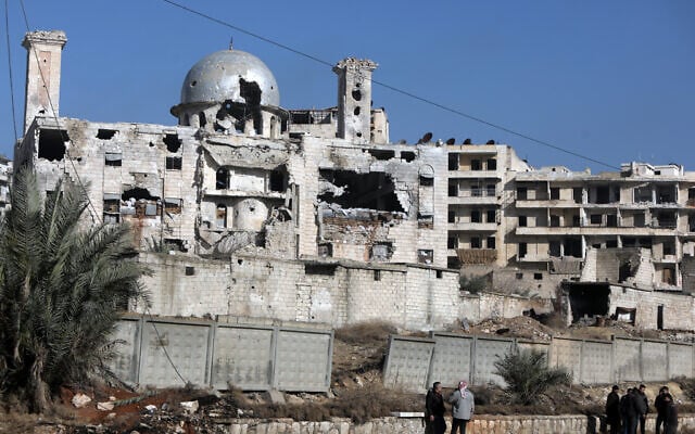 Residents of Sheikh Maqsoud neighborhood stand against the backdrop of damaged buildings, in Aleppo on January 10, 2026. (Bakr ALkasem / AFP)