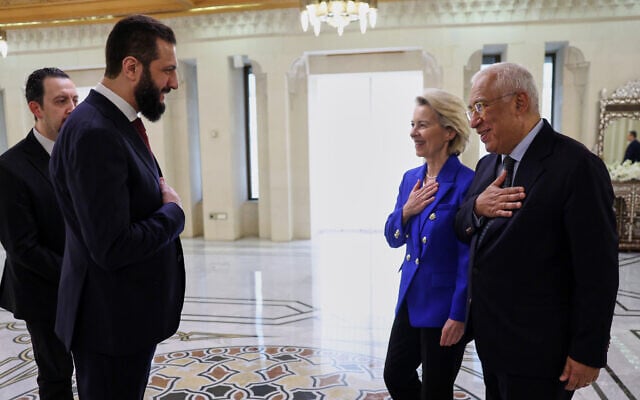 Syria’s President Ahmad al-Sharaa, left, receives European Commission President Ursula von der Leyen, center, and European Council President António Costa, right, upon their arrival at the presidential palace in Damascus, Syria, January 9, 2026. (European Commission via AP)
