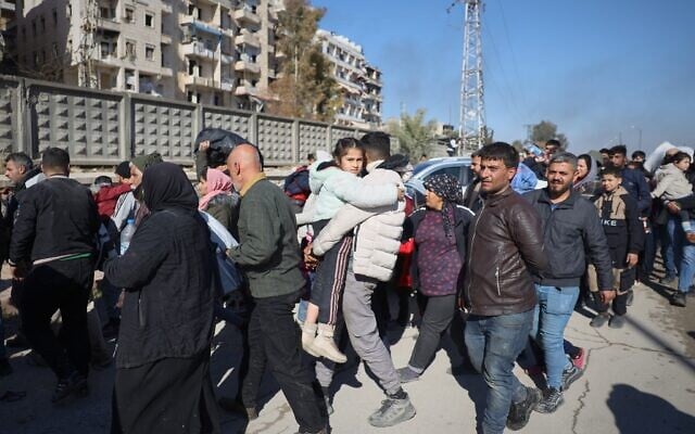 Civilians evacuate the Sheikh Maqsoud neighborhood in Aleppo, Syria, January 10, 2026. (AP Photo/Omar Albam)