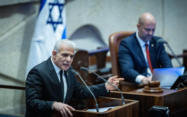Opposition Leader Yair Lapid speaks during a 40-signature debate in the Knesset plenum in Jerusalem, January 5, 2026. (Yonatan Sindel/Flash90)