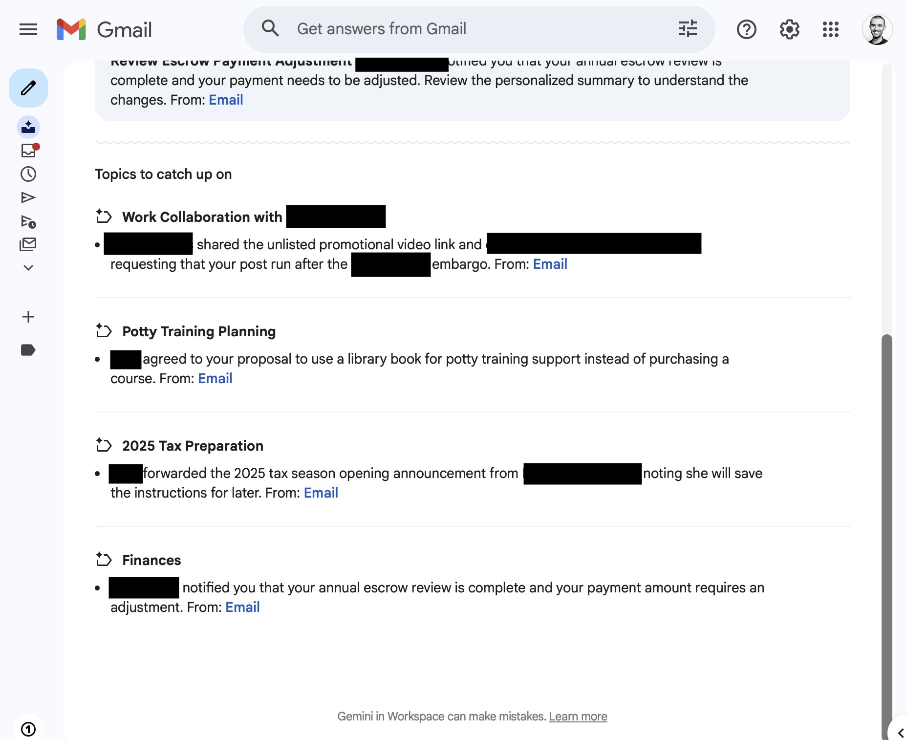 With AI Inbox, my inbox instead becomes an AI-generated page of short summaries to read. There are suggested to-dos at the top, with links to the emails they’re about if I want to dig in more or respond. Under the to-dos, there are topics to catch up on, also with links to the relevant emails. Perhaps most notably, AI Inbox has pulled in two things that I’ve archived and aren’t in my main inbox: conversations between my wife and me about tax preparation and potty training for our toddler.