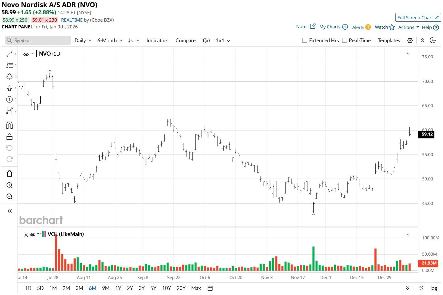 While Novo Nordisk stock did inch higher on Jan. 9, it remains down roughly 35% versus its 52-week high.