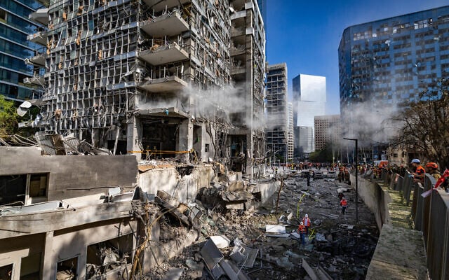 Israeli security and rescue forces at the scene where a ballistic missile fired from Iran hit and caused damage in Ramat Gan, June 19, 2025. (Chaim Goldberg/Flash90)