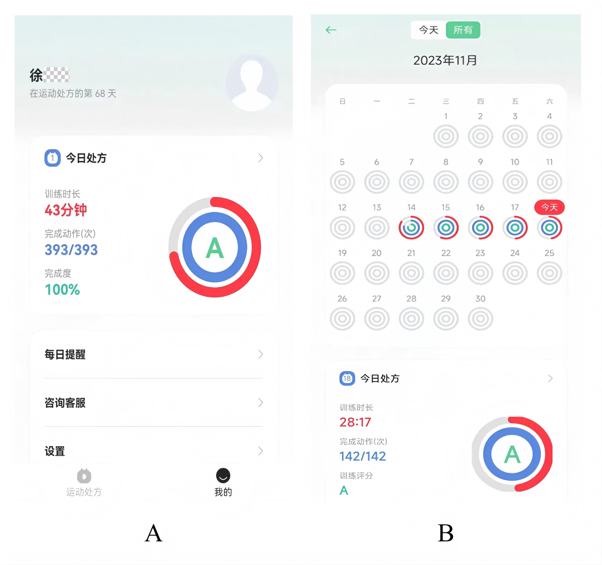 Figure 3. Postexercise evaluation and records via the “Rehabilitation Exercise Prescription” app. A: automatically generated assessment reports at the end of exercise; B: automated exercise diary recording interface.