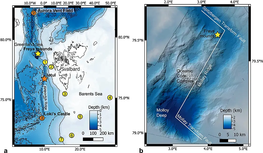 a Regional map of seeps (yellow) and vents (orange): yellow star = Freya gas hydrate mounds; orange star = Jøtul Vent Field; 1 = Vestnesa Ridge seep; 2 = Prins Karls Forland seep; 3 = Storfjordrenna gas hydrate mounds; 4 = Bjørnøyrenna seep; 5 = Leirdjupet Fault Complex; 6 = Borealis mud volcano; 7 = Håkon Mosby mud volcano; 8 = Loki’s Castle; 9 = Aurora Vent Field.