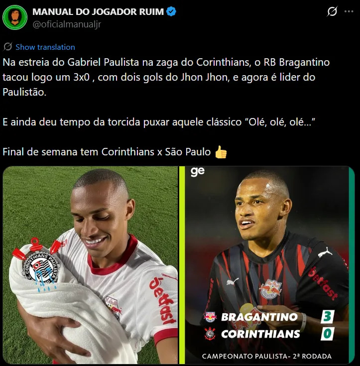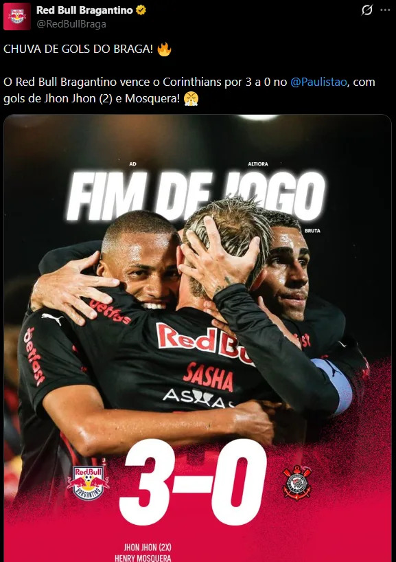 In the second round of the Paulistão 2026, Corinthians lost to RB Bragantino 3-0 at the Cícero de Souza Marques Stadium on Thursday (15).
