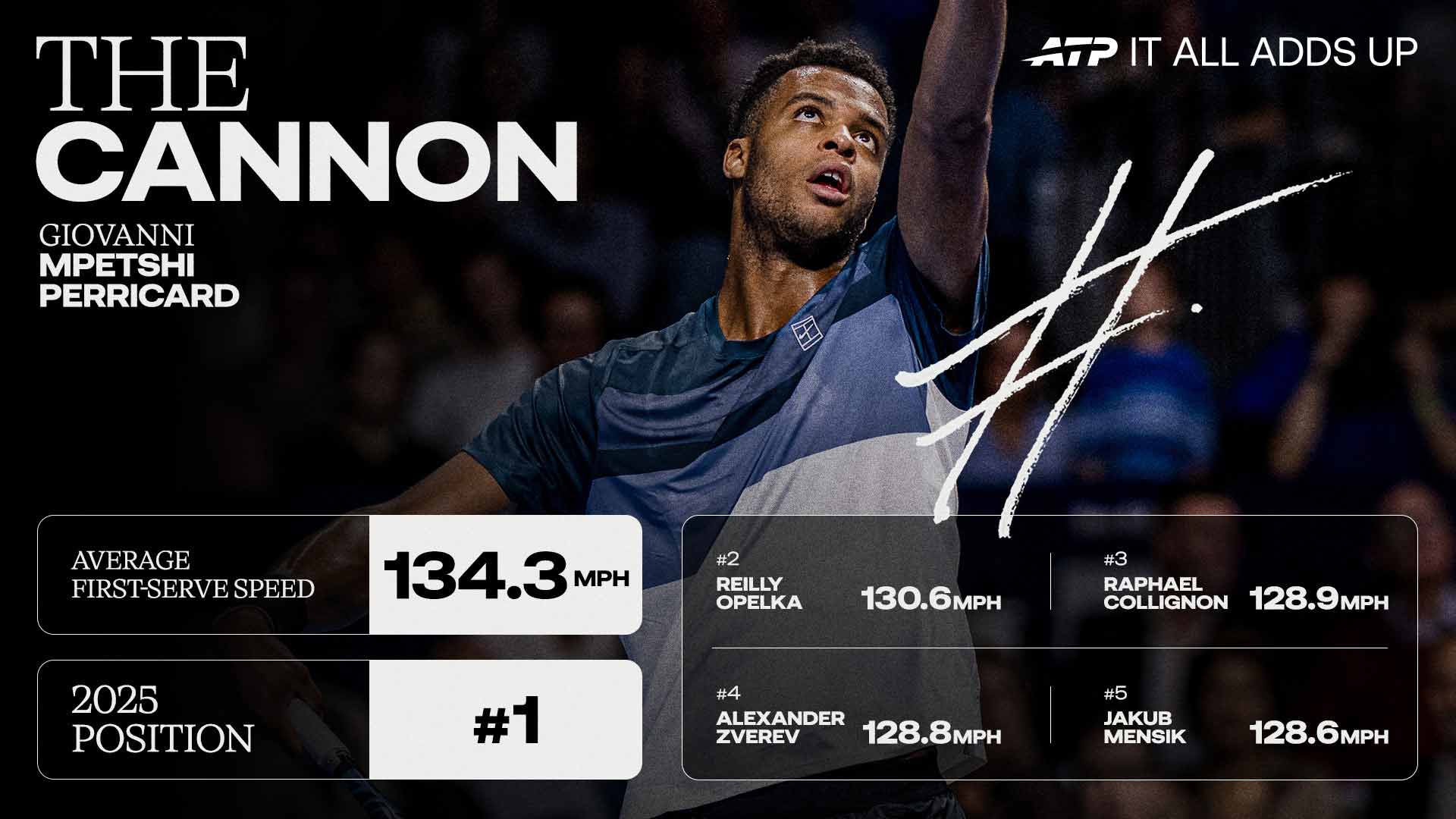 In 2025, Mpetshi Perricard led the ATP Tour in average first-serve speed, clocking in at 134.4 mph (216.3 kph). American Reilly Opelka ranked a distant second at 130.6 mph.