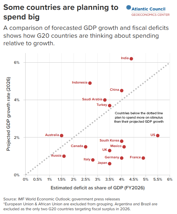 This chart shows G20 countries with stimulus plans, comparing their projected gross domestic product (GDP) growth rates for 2026 with their estimated fiscal deficits as a percentage of GDP. It’s a rough metric, but it gives a sense of how countries are thinking about spending relative to growth and debt in the year ahead. Countries below the line are planning to loosen fiscal taps.