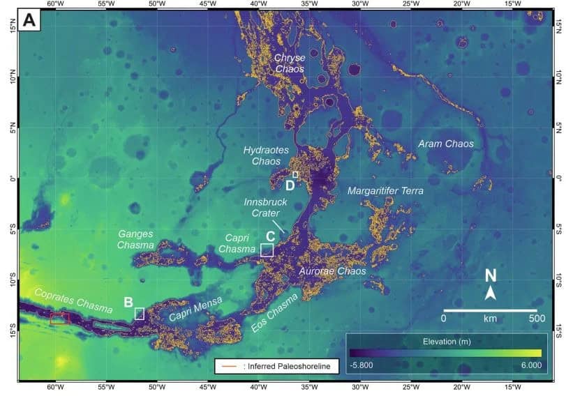 The westward extension of the inferred paleoshoreline identified in the study area (red rectangle) across the Valles Marineris depression into Chryse Chaos. Credit: Argadestya et al. 2026