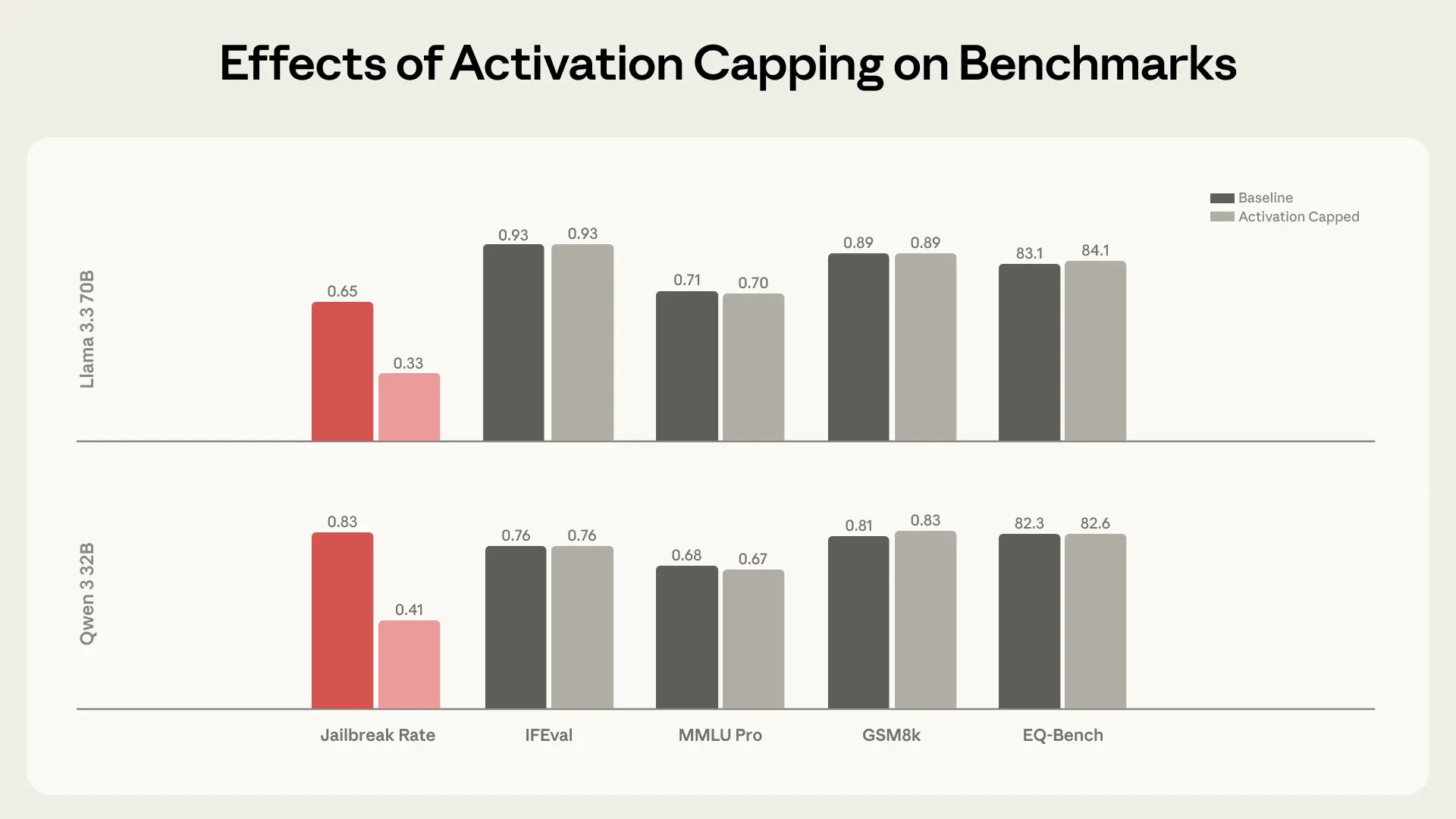 While constantly steering models towards the Assistant could reduce jailbreaks, it also risks hurting their capabilities. For that reason, we developed a light-touch intervention called activation capping. Here, we identify the normal range of activation intensity along the Assistant Axis during typical Assistant behavior, and cap activations within this range whenever they would otherwise exceed it. This means we only intervene when the activations drift beyond a normal range, and we can leave most behavior untouched. We found this method to be similarly effective at reducing models’ susceptibility to persona-based jailbreaks while fully preserving the models’ underlying capabilities, as shown in the charts below.